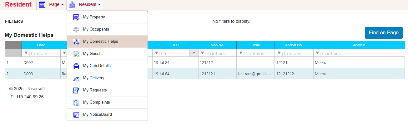 To see the list of domestic help , click on Resident -> My Domestic Help.