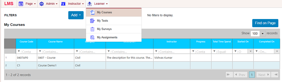 To View List of Courses assigned to you as a Learner, navigate Learner > My Courses. The Courses assigned to you as a Learner will appear.
