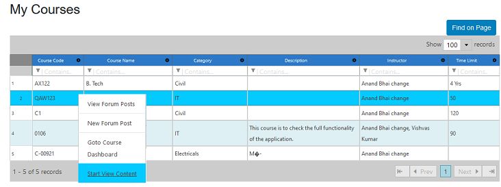 To view content of a course as a Leaner, navigate Right click on Course > Start View Content