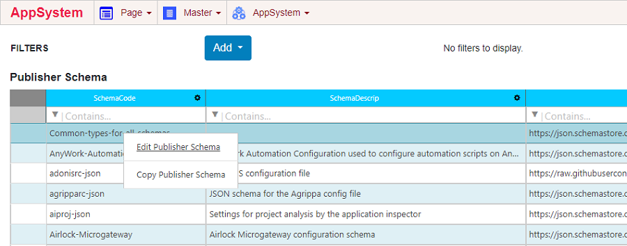 1 - Create new publisher schema clicking on Appsystem -> Publisher Schema -> Actions -> New Publisher Schema.