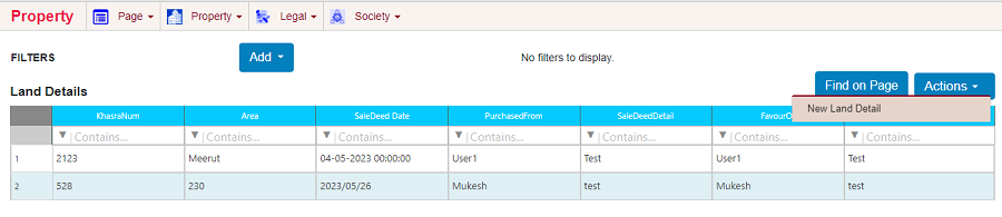 To create land details, click on Property Menu -> Land Details->Actions -> New Land Detail. Form will appear.