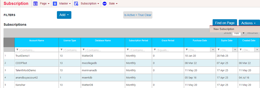 To check the listing of subscriptions created, click on Subscription -> Subscriptions. List will appear.